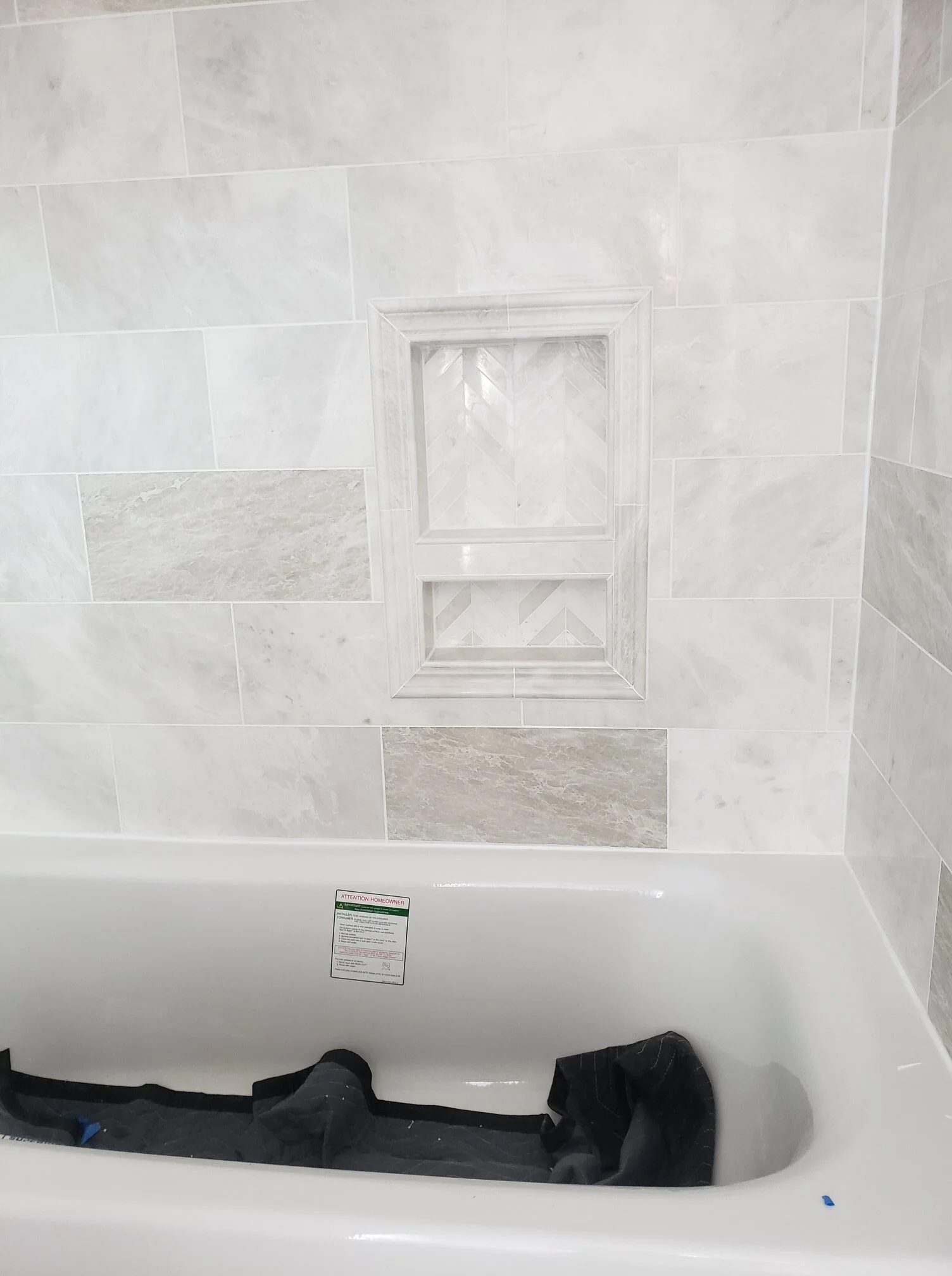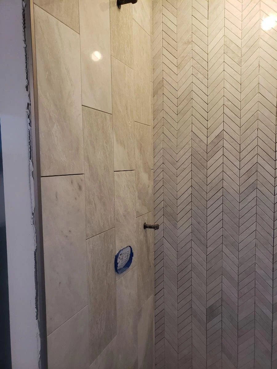 This shower and bathtub are transformed into a relaxing destination. Natural stone is arranged in a combination of patterns to create a stylish shower with hexagon floor.