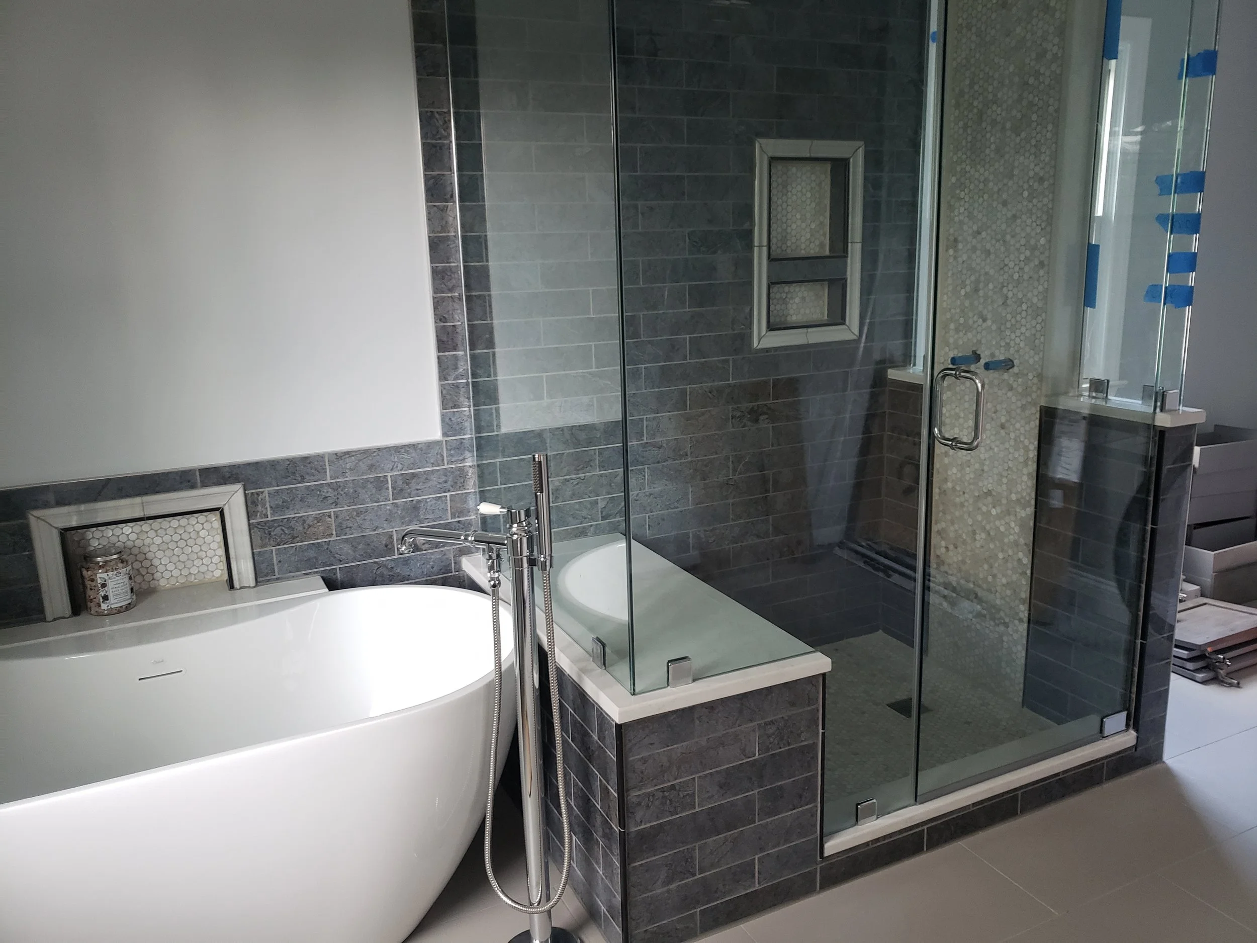This bathroom is part of a new addition added to a home in North Hanover. The light hexagon tiles accent the dark subway tiles wonderfully!